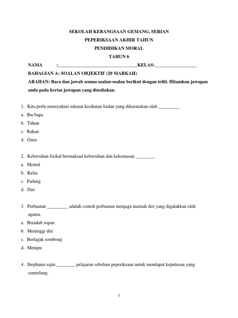 Contoh Ujian Pendidikan Moral Ting 1 Pdf